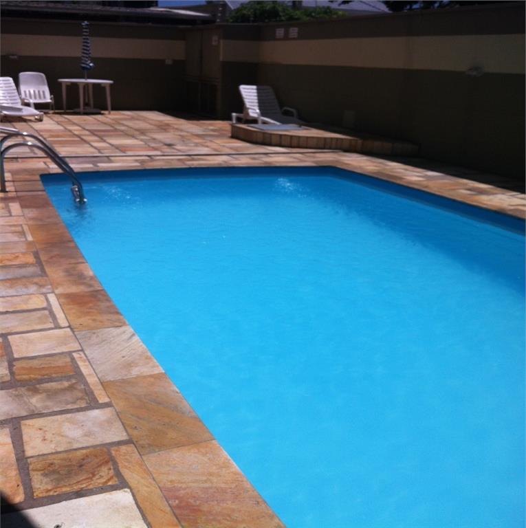 Prédio com sala de ginástica, piscina e salão de festas.